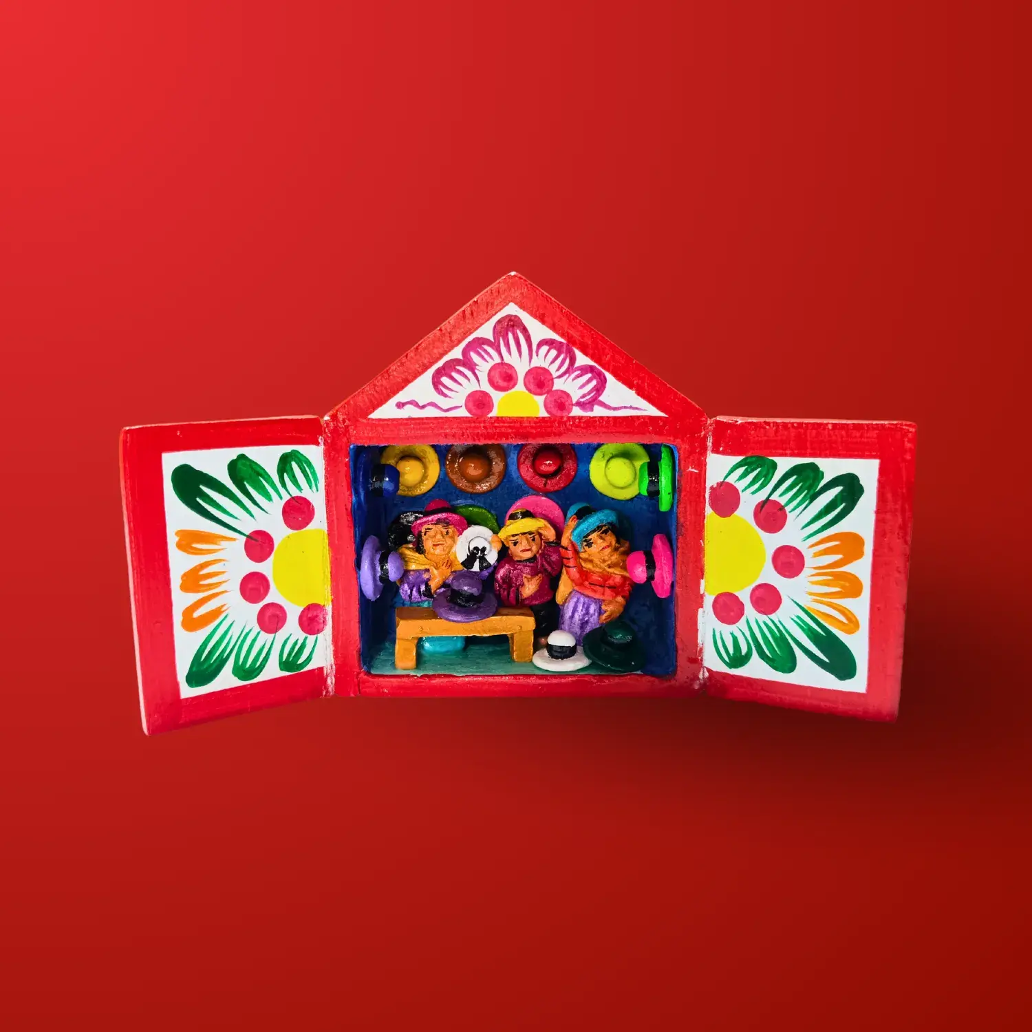 Descubre la magia de los retablos ayacuchanos con esta delicada pieza artesanal de 6 cm, ideal para coleccionar o regalar. Hecho a mano con madera y pasta modelada, este retablo representa escenas costumbristas como venta de sombreros coloridos, combinando colores vibrantes y detalles únicos que reflejan la riqueza cultural de Ayacucho. Su diseño compacto lo convierte en un accesorio perfecto para decorar cualquier espacio con autenticidad y encanto.